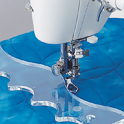 Quilt enkelt mönster med quiltlinjaler och 1/4-tums ruler foot. Den tjocka kanten på linjalkviltfoten glider smidigt runt kanten på din linjalmall.