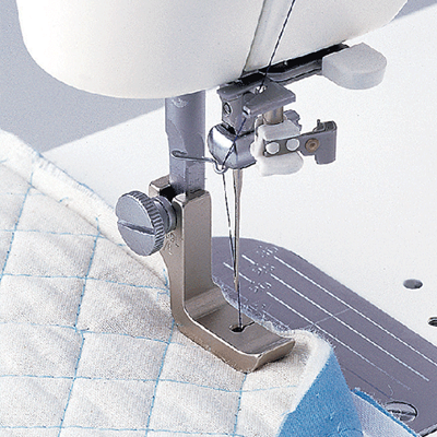 Denna pressarfot används för att skapa passpoaler och sy fast den. Spåret som sladden passerar har en diameter på ca 3 mm. Denna pressarfot används för att sy kanten av tyger tillsammans med rätsidan av passpoalerna. Använd skåran för att hålla passpoalerna på plats medan du syr.